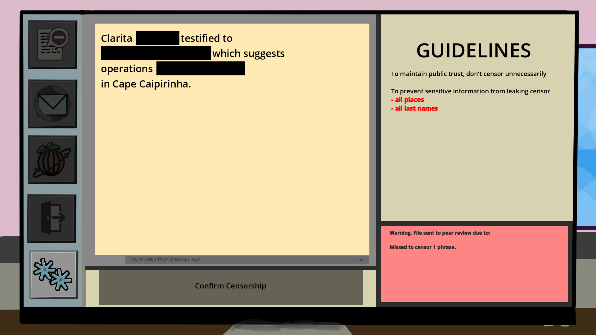 Fruitopia: MASK is a bureaucratic censorship simulator set in a world where every pearson is a fruit. Redact documents by day. Watch the news you shaped by night. Try not to think about it too much.